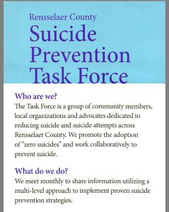 St. Peters Health Partners American Foundation for Suicide Prevention * Rensselaer County Department of Mental Health * Rensselaer County Department of Health * Rensselaer County Department of Aging * Suicide Prevention Center of NY * Unity House * Empowerment Exchange * New York State Office of People with Developmental Disabilities* Questar III * Northeast Career Planning * Daniel D Purcell Funeral Home * Northern Rivers* Mental Health Association of New York State* Damian Center *