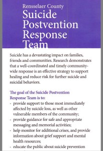 In 2013, the Rensselaer County Suicide Prevention Task Force received a grant from the NYS Officeof Mental Health to train, develop and implement a Suicide Postvention Response Team.